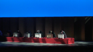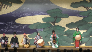 舞台に上がって、口上を申し上げました。そして私は上手に下がる。ここからは、ちんどん通信社さんの演奏とおしゃべりです。そして、下手にさがる。