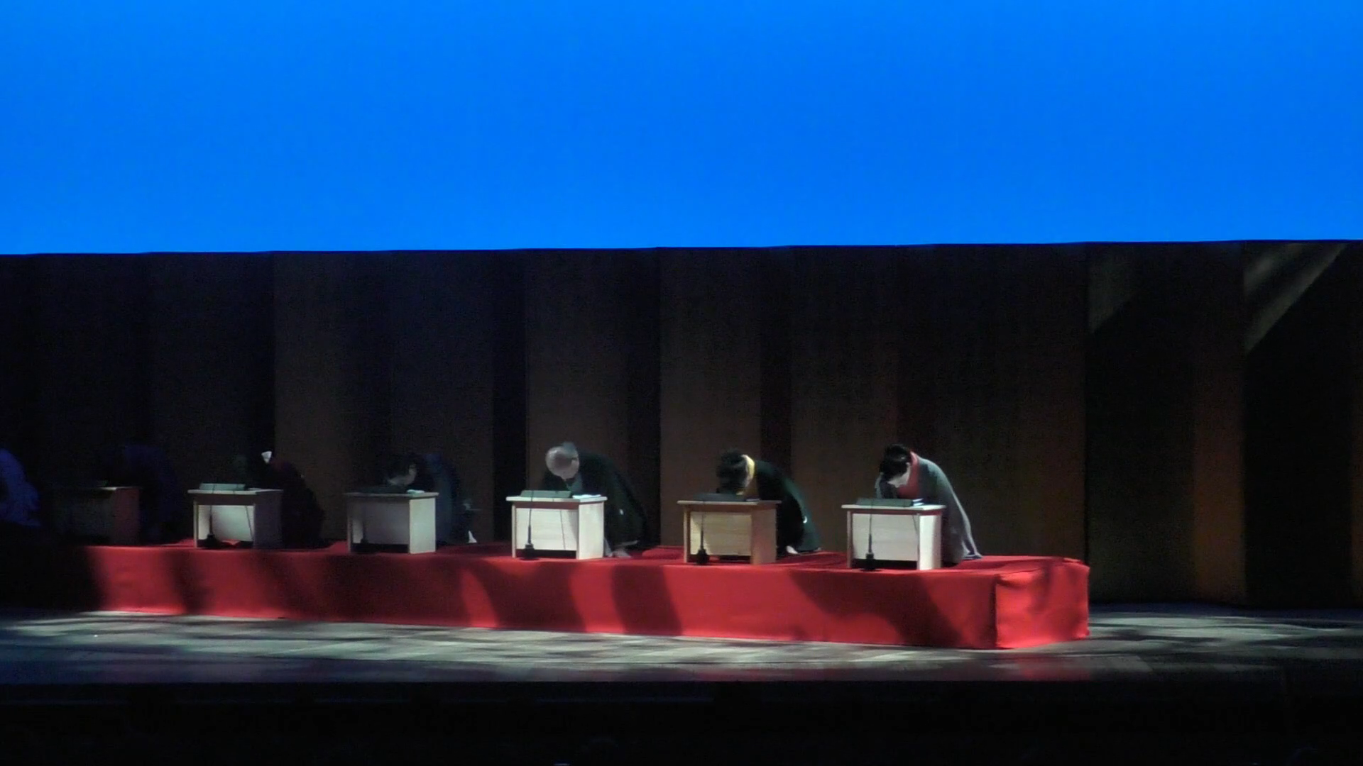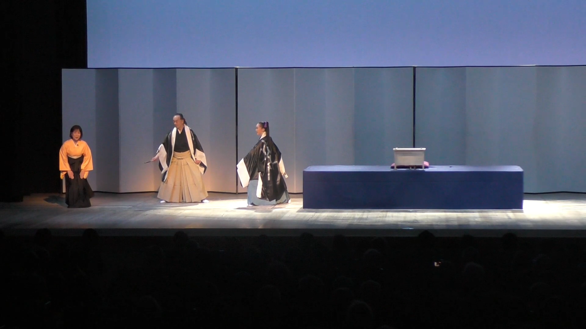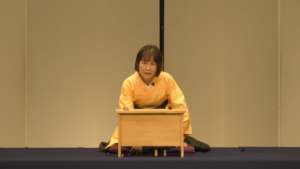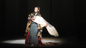 盆裏で待ち構える伊佐谷門取先生と、實川ふうさんの「舞語り 忠臣蔵幻想」が始まります。場面は4シーンです。殿中松の廊下、京都の茶屋、南部坂雪の別れ、討ち入り。正に幻想的な美しい舞の終わりに、下手から南照が登場します。